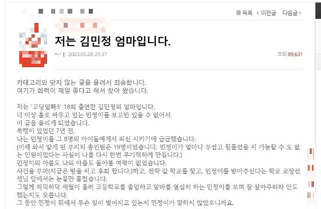 지난 28일 한 포털 사이트에는 '저는 김민정 엄마입니다'라는 제목의 글이 게재됐다. 글쓴이는 김씨 어머니로, 그는 당시 학폭 이후 학교 조치가 제대로 이뤄지지 않았다고 적었다.