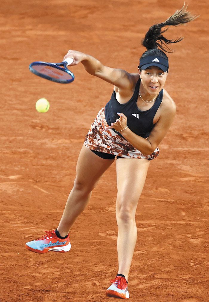 제시카 페굴라가 29일 프랑스오픈 1회전에서 대니얼 콜린스를 상대로 서브를 넣고 있다. 여자 단식 세계 3위인 한국계 페굴라는 이번 대회에서 첫 메이저 대회 우승을 노린다. /로이터 뉴스1 |