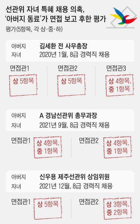 특혜 채용 의혹을 받고 있는 선거관리위원회 전·현직 간부 3명의 자녀가 면접을 볼 때 면접관이 ‘아버지 동료’들이었다고 한다. 지방 등에서 같이 근무했던 이들은 동료 자녀들에게 5항목 평가 대부분에 만점을 주었다. 일부 자녀는 보직·출장과 관사 배정 등에서 특혜도 받았다고 한다. 하지만 선관위는 지난해 자체 감사에서 특혜 채용 의혹에 면죄부를 줬다. 내부 조사가 진행 중인 사무총장과 사무차장을 징계 전에 면직 처리해 공직 재임용이나 연금 수령에서 불이익을 받지 않도록 했다. 헌법상 독립 기구라는 이유로 감사도 피하고, 징계와 그에 따른 불이익도 회피했다. 감시 사각지대에서 자기들끼리 이익을 누리는 ‘신의 직장’이 된 셈이다.