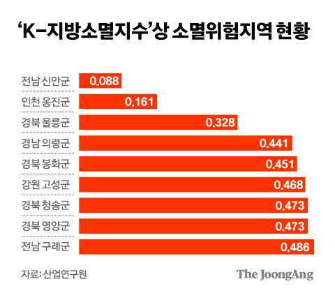 K-지방소멸지수는 구체적으로 ▶1인당 경상연구개발비 ▶산업다양성 지수 ▶1인당 지역내총생산(GRDP) ▶인구 증감률 등 6개 항목을 기준으로 분석한 결과다. 인구 감소가 출생률 등 자연적 요인보다 외부 유출 등 사회적 요인에 더 큰 영향을 받는다는 데 무게를 뒀다. 지수가 0.5 미만이면 소멸위험지역에 해당한다. 신안군은 소멸지수가 0.09로 가장 낮다. 산업연구원은 이런 내용이 담긴 보고서를 지난해 11월 발표했다.