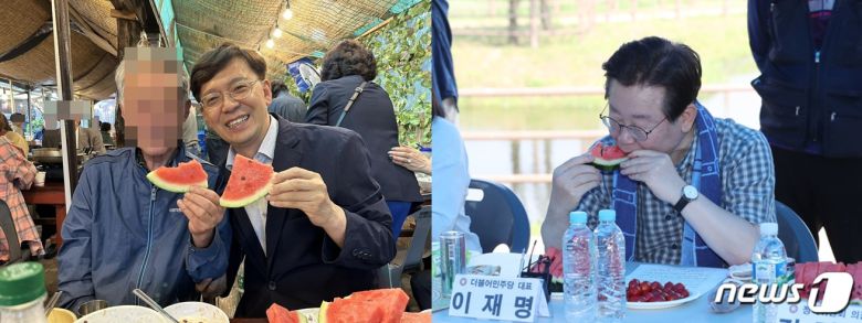 이재명 더불어민주당 대표와 친명계인 현근택 민주연구원 부원장이 수박을 먹는 모습. (SNS 갈무리) ⓒ 뉴스1 |