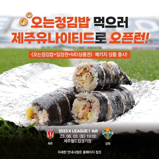 제주는 6월 3일(토) 오후 7시 제주월드컵경기장에서 열리는 하나원큐 K리그1 2023 16라운드 홈 경기를 앞두고 <오는정김밥+입장권+MD 상품권> 패키지 상품을 출시한다.