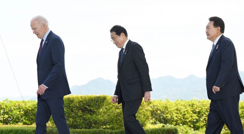 G7 정상회의 참관국 자격으로 일본을 방문 중인 윤석열 대통령이 지난 21일 히로시마 G7 정상회의장인 그랜드프린스호텔에서 열린 한미일 정상회담에 앞서 조 바이든 미국 대통령, 기시다 후미오 일본 총리와 기념촬영을 마친 뒤 회담장으로 향하고 있다. [연합]