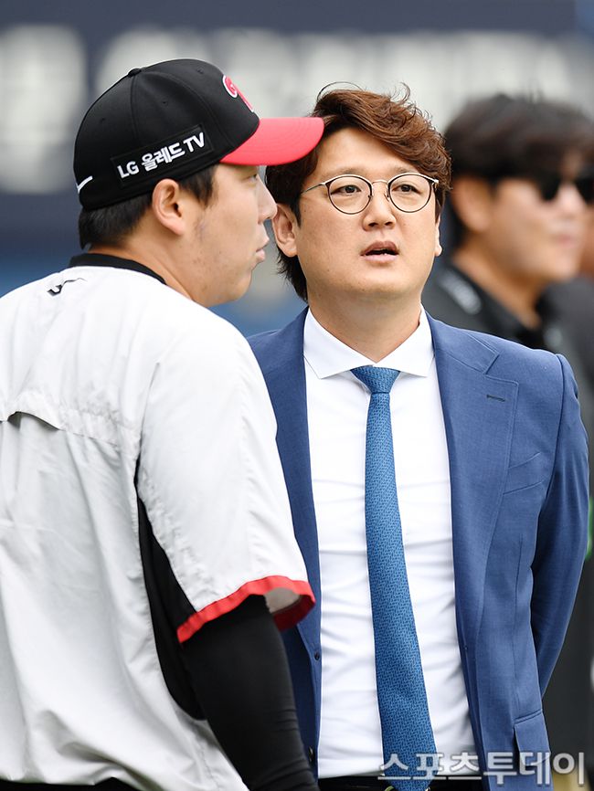 [스포츠투데이(잠실)= 권광일 기자] 2023 신한은행 SOL KBO리그 롯데 자리언츠와 LG 트윈스 경기가 30일 오후 서울 잠실야구장에서 열린다. LG 김현수가 김선우 해설위원과 대화를 나누고 있다. 2023.05.30.