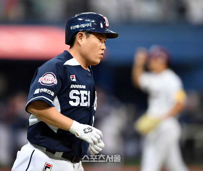 두산 3번타자 양의지가 16일 고척스카이돔에서 열린 2023 프로야구 키움히어로즈와 두산베어스의 경기 8회초 선두타자로 나와 김동혁을 상대로 좌월 솔로홈런을 터트린 후 홈인하고 있다. 고척 | 강영조기자 kanjo@sportsseoul.com