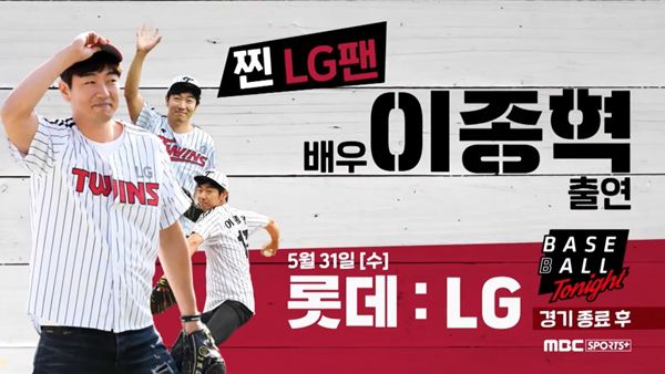 야구 하이라이트 프로그램 ‘베이스볼 투나잇’은 31일(수) 서울 잠실구장에서 열리는 롯데 자이언츠와 LG 트윈스와의 경기가 종료된 뒤 MBC스포츠플러스에서 생방송 된다. 이번 방송에서는 LG의 오랜 팬으로 알려진 배우 이종혁이 특별 출연할 예정이다.