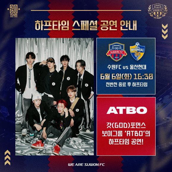 앞선 지난 4월 ATBO는 프로야구 팀 키움 히어로즈 시구·시타자로 나섰던 바, 야구에 이어 축구 하프타임 축하 무대까지 접수하며 '라이징 루키' 존재감을 증명하고 있다. 그라운드를 빛낼 ATBO만의 '긍정 에너지'가 관중 및 선수들에게 가까이 전달될 수 있을지 기대를 모은다.
