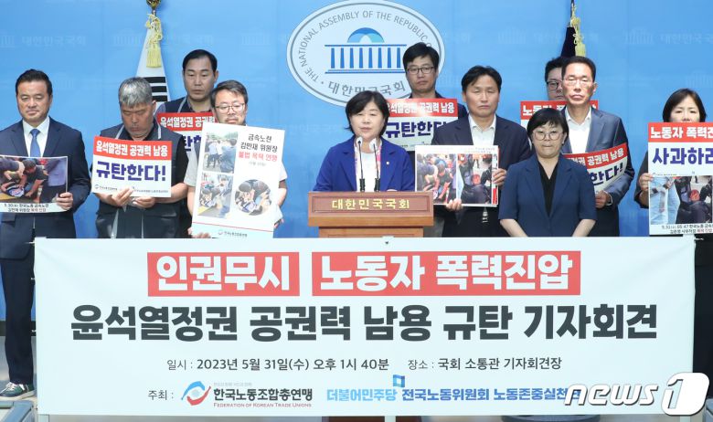 더불어민주당 서영교, 김주영, 이수진, 양이원영, 박주민, 임종성, 김상희, 최혜영 의원과 한국노총 김동명 위원장을 비롯한 노조원들이 31일 오후 서울 여의도 국회 소통관에서 '포스코 하청노조 고공 농성 과정에서 발생한 공권력 남용 및 폭력 진압 규탄' 기자회견을 하고 있다. 2023.5.31/뉴스1 ⓒ News1 송원영 기자