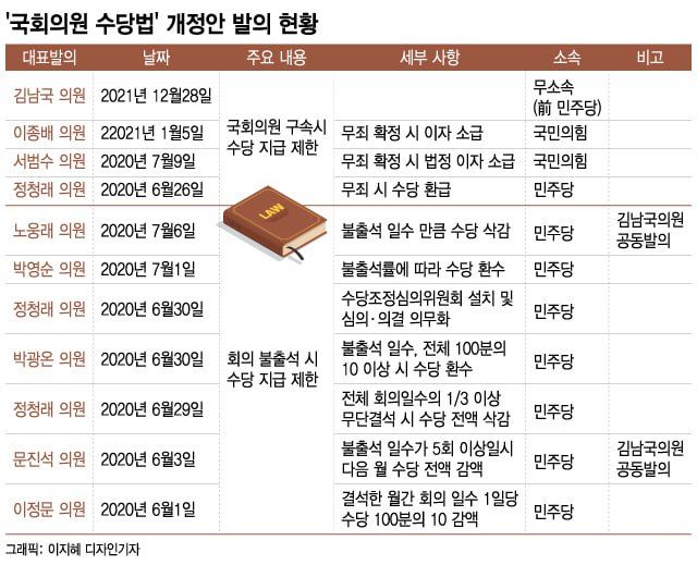 국민의힘에서 발의한 법안은 대부분 김 의원 법안처럼 구속된 기간 중의 수당 등을 제한하자는 내용이다. 관련 법안은 서범수·이종배 의원이 각각 2020년과 2021년 대표 발의했다. 이 같은 법안들은 발의 후 관련 상임위원회에 계류된 상태다.