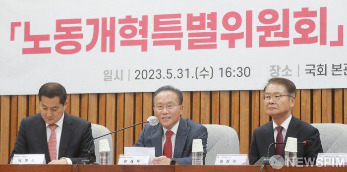 [서울=뉴스핌] 이형석 기자 = 윤재옥 국민의힘 원내대표가 31일 오후 서울 여의도 국회에서 열린 노동개혁특별위원회 확대회의에서 모두발언을 하고 있다. 2023.05.31 leehs@newspim.com