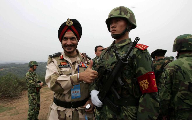 중국과 인도 국경 수비대의 양국 병사들. 최근 급격히 나빠진 관계가 무색할 만큼 분위기가 좋아 보인다./제공=신화통신.