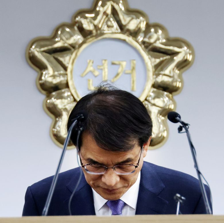 노태악 중앙선거관리위원장이 31일 오후 과천 중앙선거관리위원회에서 고위직 간부들의 자녀 특혜 채용 의혹에 대한 특별감사 결과와 후속대책을 발표하기에 앞서 사과 인사를 하고 있다. [연합]