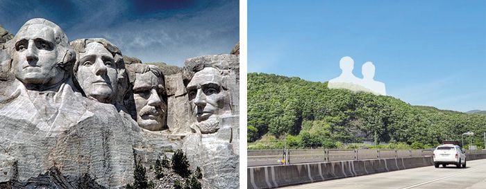 울산시가 시비 250억원을 들여 국도변 야산에 30~40m 높이의 기업인들의 대형 흉상(오른쪽 사진) 건립을 추진하겠다고 나섰다. 미국 러시모어산 대통령 조각(왼쪽 사진)과 같은 랜드마크를 만들겠다는 취지다. /울산시