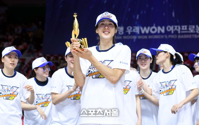 우리은행 김단비가 23일 부산 사직실내체육관에서 열린 신한은행 SOL 2022-2023 여자프로농구 챔피언결정전 시상식에서 MVP 트로피를 들고 포즈를 취하고 있다. 2023. 3. 23.사직 | 최승섭기자 thunder@sportsseoul.com