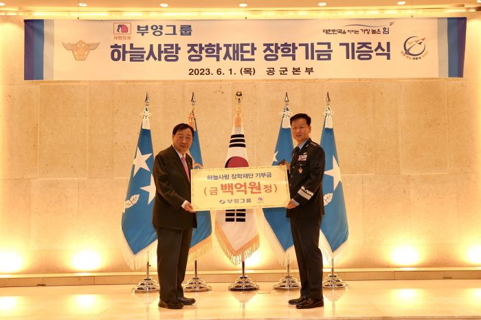 부영그룹이 사회공헌활동을 이어가고 있다. 이달에는 호국보훈의 달을 맞아 공군 하늘사랑 장학재단에 기부금 100억원을 전달했다.