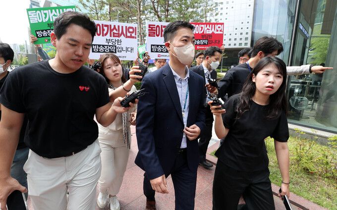 지난달 30일 서울경찰청 반부패·공공범죄수사대 수사관이 서울 마포구 상암동 MBC 사옥에서 ‘한동훈 법무부 장관 개인정보 유출’ 혐의 관련 MBC기자의 사무실 압수수색을 시도하다 언론노조 등의 항의에 철수하며 취재진 질문을 받고 있다. 뉴스1