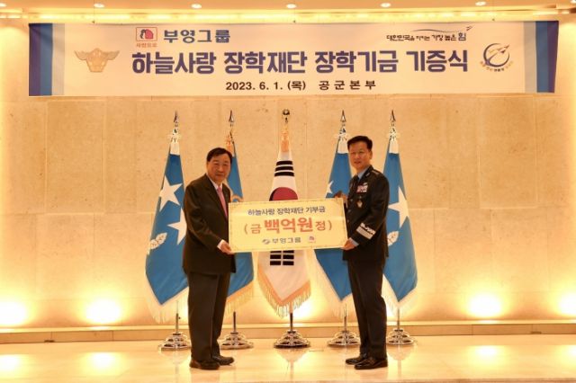 부영그룹이 공군 하늘사랑장학재단에 기부금 100억 원을 전달했다.