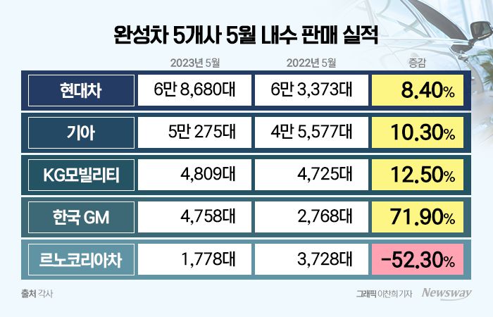 그랜저 5월 1만1000대 돌파…KG·GM 3위 싸움 본격화