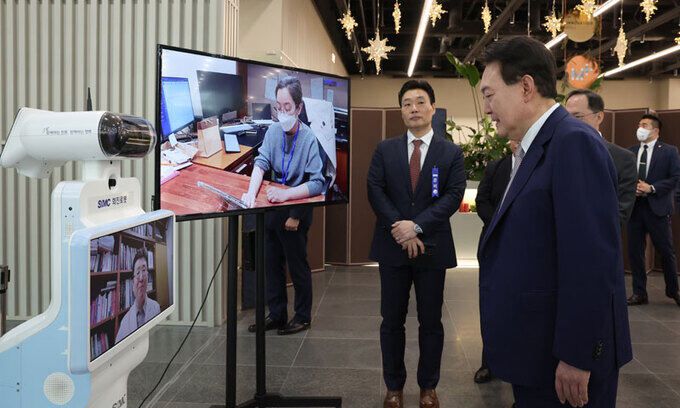 화상연결 체험하는 尹대통령 윤석열 대통령이 1일 서울 강서구 서울창업허브 엠플러스에서 열린 제5차 수출전략회의에 앞서 삼성서울병원의 회진로봇을 통해 화상 연결 체험을 하고 있다. 대통령실 제공 |