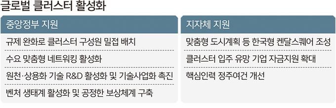 정부는 클러스터 활성화를 위해 입주 업종 제한 규제를 완화해 법률·회계·액셀러레이터(AC)·벤처캐피탈(VC) 등 사업지원 서비스 기업도 입주할 수 있도록 허용할 계획이다. 입지규제와 정부출연연구원 유휴부지 용도 변경, 건폐율·용적률 관련 규제 완화도 추진한다.