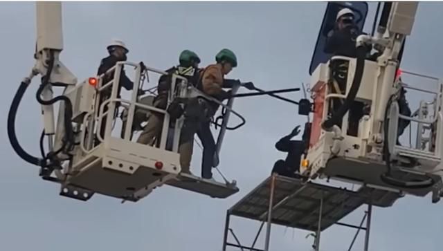 지난달 31일 오전 전남 광양시 포스코 광양제철소 앞에서 고공 농성 중이던 금속노련 간부를 경찰이 진압하고 있다. 한국노총 제공