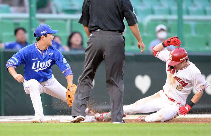 프로야구 SSG 최지훈(오른쪽)이 1일 SSG랜더스필드에서 열린 삼성과의 경기 3회말 2사 2루때 3루타를 때리고 슬라이딩하고 있다.