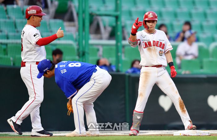 SSG 1번타자 최지훈이 1일 2023 프로야구 SSG랜더스와 삼성라이온즈의 경기 3회말 2사 2루에서 1타점 3루타로 출루하고 있다. 2023.06.01.