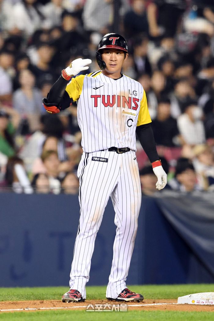 LG 트윈스 오지환이 1일 잠실구장에서 열린 2023 KBO리그 롯데 자이언츠와 경기 8회말 2사 3루 상황에서 롯데 투수 최이준을 상대로 1타점 3루타를 친 뒤 세리머니를 하고 있다. 2023. 6. 1.