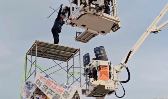 사진은 고공 농성 중인 조합원과 사다리차에 올라탄 경찰이 대치하는 모습. 전남경찰청 제공 |