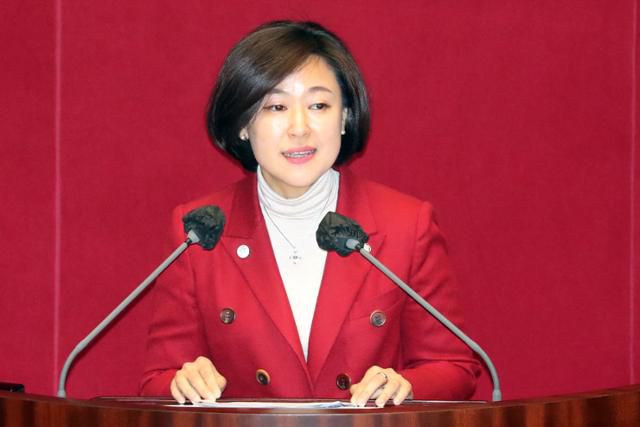 황보승희 국민의힘 의원이 4월 11일 서울 여의도 국회에서 제2차 국회의원 선거제도 개선에 관한 결의안 심사를 위한 전원위원회에서 발언을 하고 있다. 뉴스1