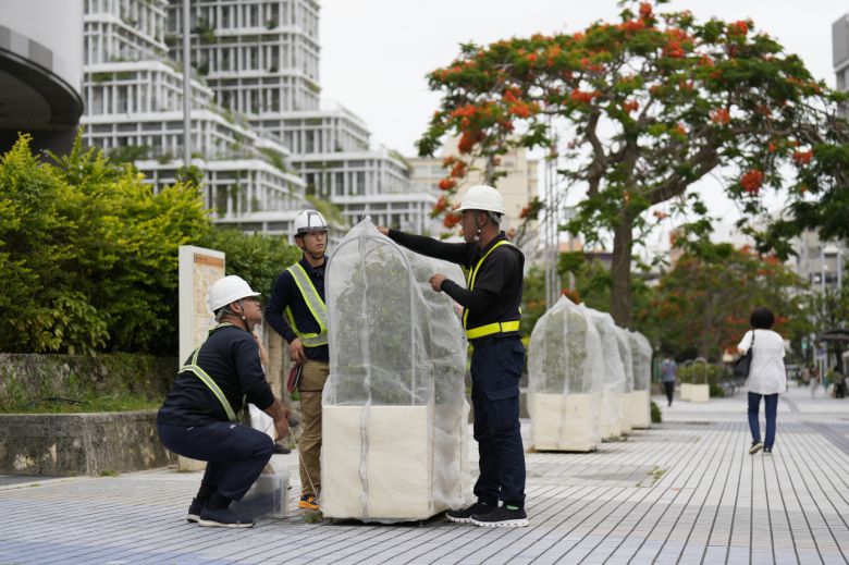 일본 오키나와현 중심 도시 나하의 관리인들이 지난달 31일 제2호 태풍 '마와르'에 대비해 거리에 있는 화분들에 덮개를 씌우고 있다. 최근 대만 동쪽 해상에서 방향을 튼 마와르는 이날부터 오는 3일까지 일본 오키나와 지역에 피해를 줄 것으로 보인다. [연합]