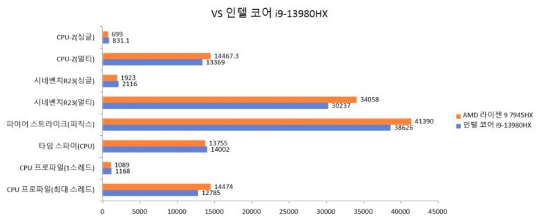 인텔 코어 i9-13980HX는 24코어 32스레드, 최대 부스트 클럭 5.6GHz을 가져 인텔 모바일 프로세서 중 가장 높은 성능을 지녔다. 전체 벤치마크를 비교해 보면, 멀티 성능은 라이젠 9 7945HX가, 싱글 성능은 코어 i9-13980HX가 우위를 지녔음을 알 수 있다.