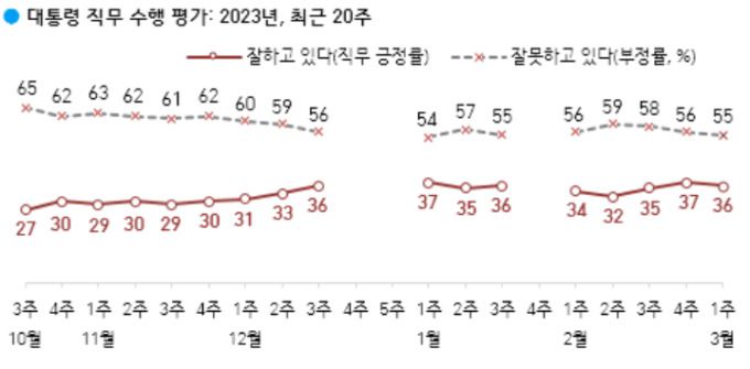 여론조사 전문기관 한국갤럽이 지난달 30일부터 1일까지 전국 만 18세 이상 1002명에게 물은 결과 윤 대통령의 지지율은 35%로 지난주 대비 1%p 하락했다.