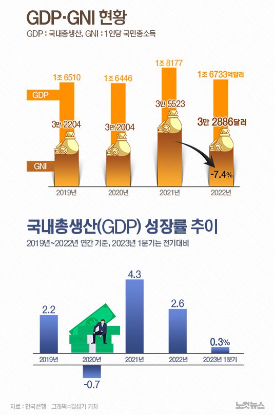 1인당 소득 3.3만 달러 7.4%↓…올해 1분기 GDP 0.3% 성장[그래픽뉴스]