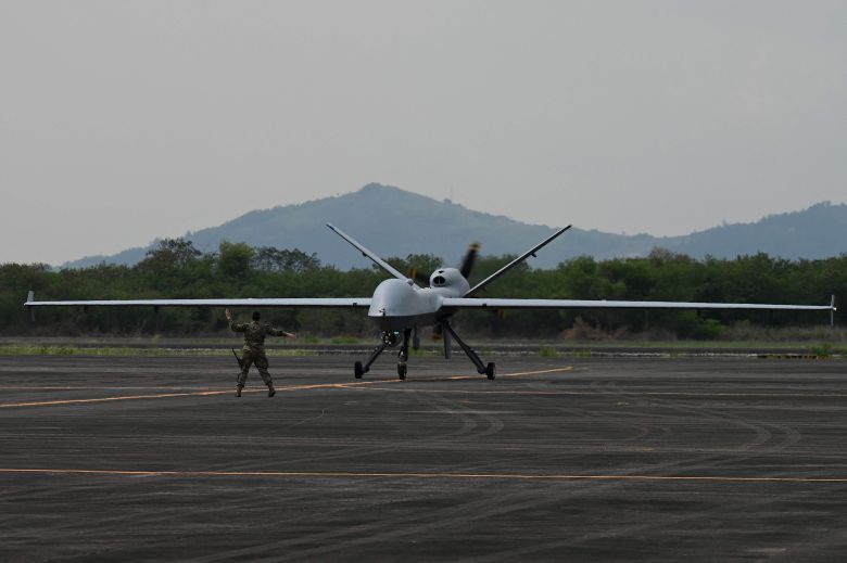 4월23일 미 공군의 MQ-9 리퍼(Reaper) 드론이 필리핀 수빅만의 경제 무역 자유지역 내 기지에서 한 병사의 유도를 받으며 착륙하고 있다./AFP연합뉴스