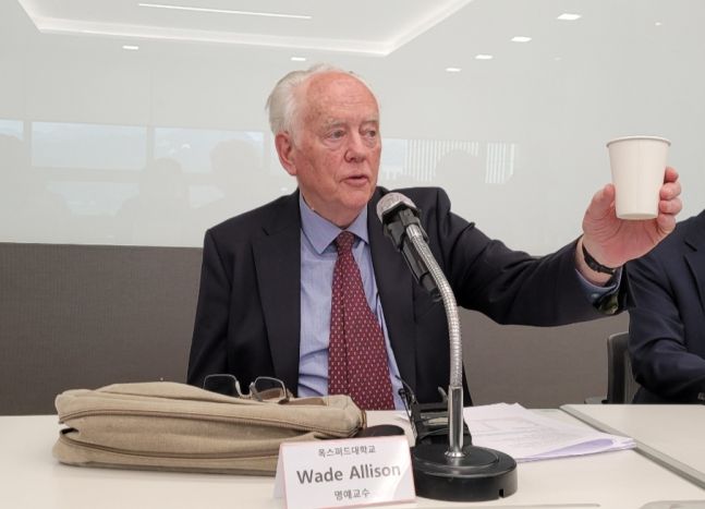 웨이드 앨리슨 영국 옥스퍼드대 명예교수가 지난달 15일 서울 종로구 HJ비즈니스센터에서 한국원자력학회 초청 기자간담회에서 '희석되지 않은 후쿠시마 오염수가 컵에 있더라도 바로 마실 수 있다'고 설명하는 모습. / 사진=김인한 기자 |