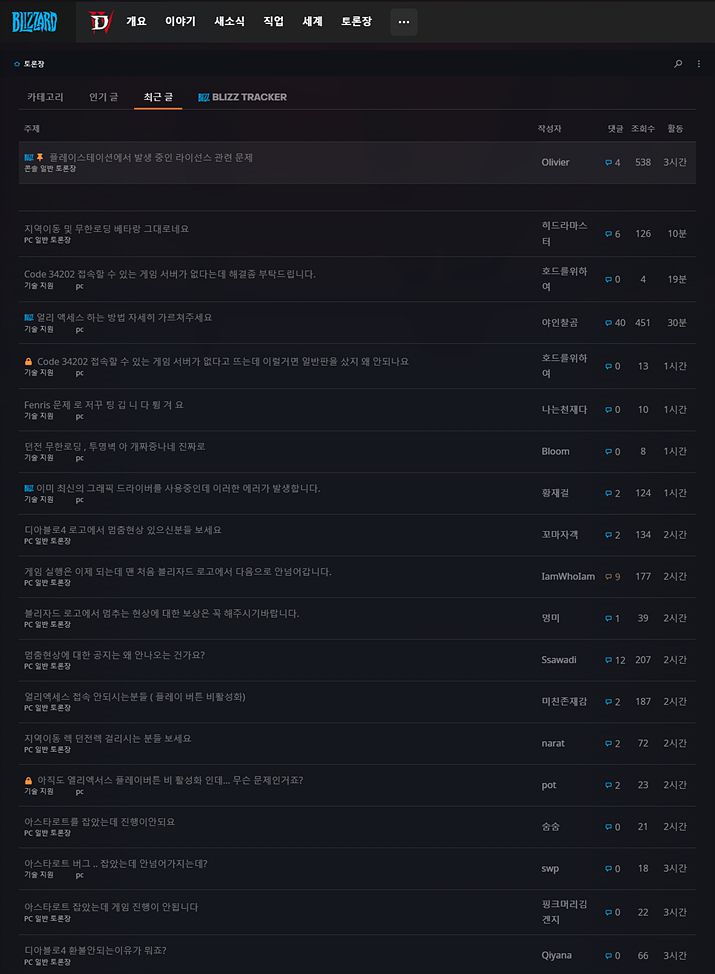 ▲ 디아블로 4 공식 포럼을 가득 채운 오류 제보 (사진출처: 디아블로 4 공식 포럼) |