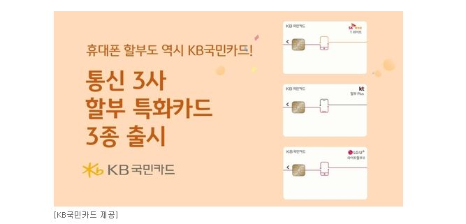 KB국민카드는 SKT, KT, LG유플러스 등 통신3사와 제휴를 맺고 단말기 장기 할부를 이용할 때 월 최대 1만4000원의 통신비를 할인하는 'T라이트 KB국민카드', 'KT 할부 Plus KB국민카드', 'LG U+ 라이트할부II KB국민카드'를 2일 출시했다.
