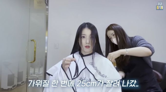 아이유는 25㎝ 정도 잘려나간 머리칼을 보고는 "진짜 가벼워지겠다"며 들뜬 모습을 보였다. 헤어 스타일리스트의 제안으로 커트 브이로촬영하게 됐다는 그는 "머리 자르는 모습은 처음 공개한다"고 말했다.