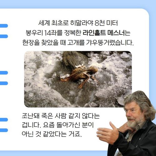 세계 최초로 히말라야 8천 미터 봉우리 14좌를 정복한 라인홀트 메스너는 현장을 찾았을 때 고개를 갸우뚱거렸습니다.