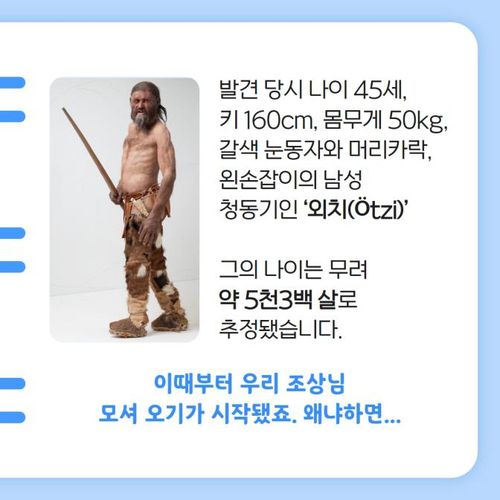 청동기 시대 사람 '외치(Otzi)'로 불렸던 이 남성은 발견 당시 45세, 키 160cm, 몸무게 50kg, 갈색 눈동자와 머리카락, 왼손잡이였습니다. 사망 시기는 무려 5천3백여년 전으로 추정됐습니다.