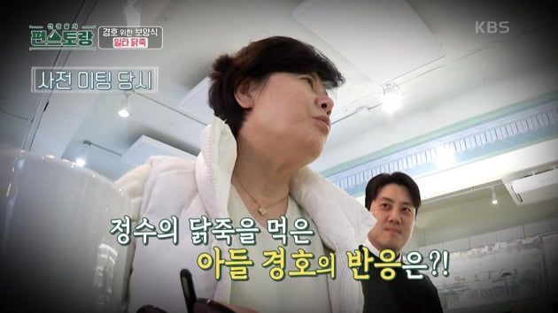 박정수는 커다란 토종닭을 각종 한약재와 함께 푹 삶은 후, 일일이 뼈와 껍질을 발라냈다. 평소 씹는 것과 느끼한 것을 싫어하는 아들 정경호를 위해서였다. 한참을 정성으로 살을 발라내는 일이 고될 법도 하지만 박정수는 행복해했다. 이후에도 박정수는 닭 국물에 발라낸 살코기를 넣고 자신만의 특급 비법 재료들을 넣어 끓이고 또 끓였다.