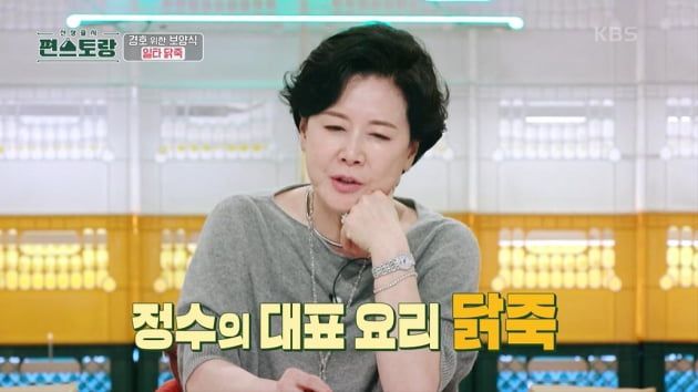 박정수는 남편 정을영 감독을 위해, 시어머니의 레시피로 꽈리고추깍두기를 만들었다. 뿐만 아니라 여름철 가족의 건강을 책임지는 특급 보양식 닭죽도 만들었다. 각종 한약재와 통녹두, 전복, 낙지를 넣고 끓이는 박정수 표 닭죽은 오랫동안 삶은 닭 살코기를 다 발라내고 오랫동안 불 앞에서 계속 저어줘야 하는 정성 가득 요리였다. 박정수는 "여름에 3번 정도 만드는 것 같다"라며 "(아들 정경호가) 제가 해주는 닭죽이 제일 맛있다고 그런다. 그 닭죽이면 평생 그것만 먹고 살 수 있다고 할 정도로 좋아한다"라고 말했다.