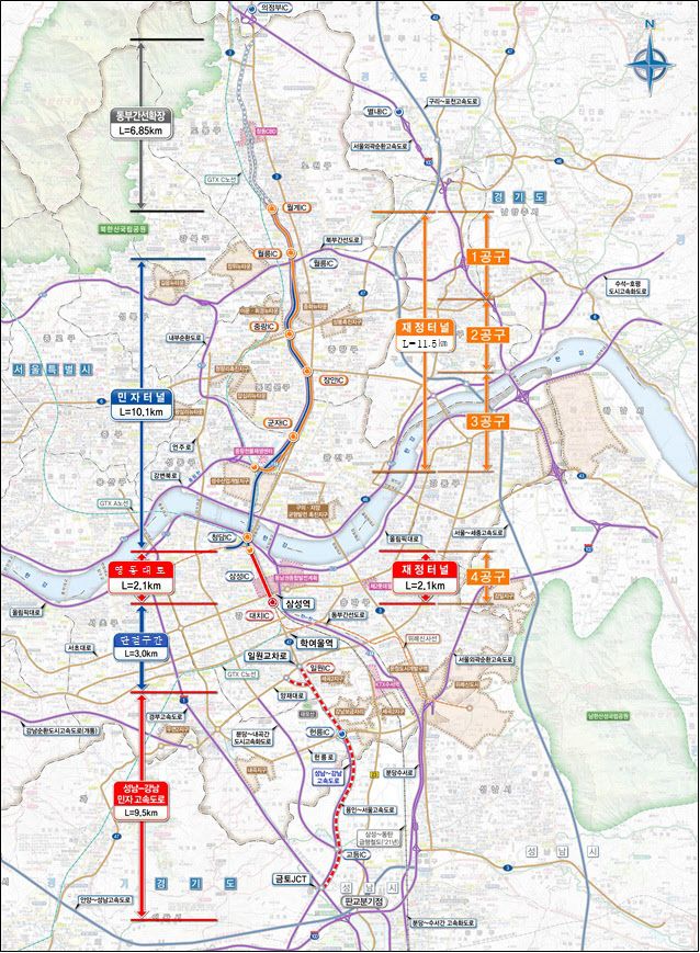 특히 노원구 월계1교부터 강남구 삼성역 및 일원터널까지 구간은 지하화를 추진한다. 지하화 도로는 두 가지로 나눠 건설될 예정이다. 하나는 ‘도시고속도로(민자터널)’고 다른 하나는 ‘지역간선도로(재정터널)’다. 민자터널의 사업시행자가 동서울지하도로(대우건설 컨소시엄)다.