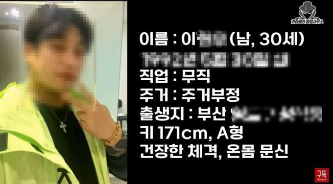 유튜브 채널 ‘카라큘라 탐정사무소’는 2일 부산 돌려차기 폭행사건 피의자 이모(30)씨의 실명과 사진, 직업, 주거지, 키 등을 공개했다. 이씨의 과거 전과기록도 함께 공개했다.