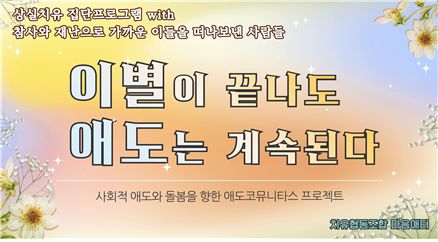 사회적 재난과 참사로 상실을 경험하고 있는 유가족들과 함께 '고통의 연대'를 구축하고자 치유협동조합 마음애터는 2023년 6월, 7월 두 차례에 걸쳐 집단치유 프로그램 [이별이 끝나도 애도는 계속된다 : 사회적 애도와 돌봄을 향한 "애도 코뮤니타스 프로젝트"를 진행하려고 한다. 이 과정을 통해 참사 피해 유가족들이 슬픔과 두려움에서 희망과 회복의 과정으로 나아갈 수 있도록 지지하고 연대하는 마음을 담아보려 한다. 함께 해주시길 간절히 기원한다.