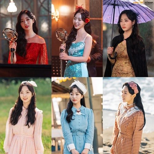반면 무대 밖에서 우현진은 도트 무늬부터 체크 패턴까지 1930년대 복고풍 의상을 완벽하게 소화한 모습이다. 또 그는 파스텔톤의 원피스에 리본 아이템으로 사랑스러움을 배가시켜 설렘으로 가득 찬 여희의 인간적인 면모를 돋보이게 한다.