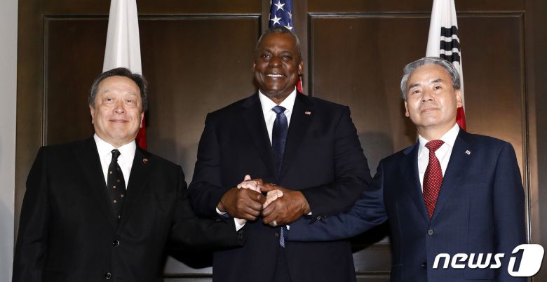 아시아안보회의(샹그릴라 대화)에 참석 중인 이종섭 국방부 장관이 3일(현지시간) 싱가포르 샹그릴라 호텔에서 열린 한·미·일 국방장관회담에 앞서 로이드 오스틴 미국 국방부 장관, 하마다 야스카즈 일본 방위상과 기념촬영을 하고 있다. 왼쪽부터 하마다 야스카즈 일본 방위상, 로이드 오스틴 미국 국방장관, 이종섭 국방장관. 2023.6.3/뉴스1 ⓒ News1 박지혜 기자 |