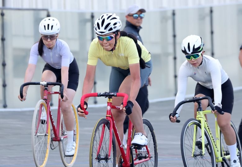 3일 오후 강원 양양군 사이클경기장에서 열린 제58회 강원도민체육대회 여자일반1부 경륜 경기에서 나화린(철원·사진 가운데)이 힘차게 출발하고 있다. 성전환 여성으로서는 국내 최초로 공식 경기에 출전한 나씨는 이날 1위를 차지했다./연합