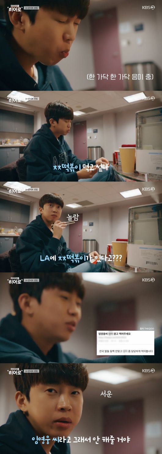이에 스태프는 임영웅에게 “LA에도 XX 떡볶이 매장이 있다”고 밝혔고, 임영웅은 깜짝 놀란 표정을 지었다.